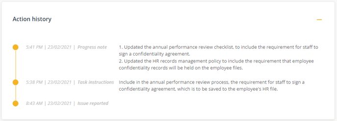 - Progress note - choose this option if the task is only partially completed. For instance, if the task requires a number of actions, you might make a progress note stating action taken to date, eg. 'Updated the annual performance review checklist, to include the requirement for staff to sign a confidentiality agreement.'