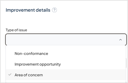 The Improvements register now supports a new issue type: Area of Concern. This gives teams a clearer way to record issues that need attention before they become full non-conformances.