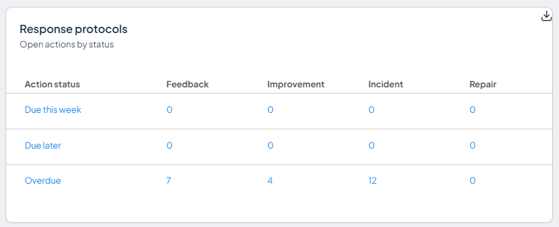 Another way to monitor the status of all open Response protocol tasks is via the Response protocols dashboard widget. This widget will display the status of all open actions by register and current status.