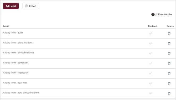 | Re-enable a Label | While Show inactive is on, check the tick in the Enabled column and click Save. |