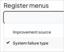 | System failure type | When submitting a non-conformance report on the Improvement register, this menu provides an overview of the various systems within the organisation that may encounter failures leading to non-conformances. For instance, IT systems and Financial systems are common examples of systems that may fail. This list is an essential part of the causal analysis process for non-conformances.