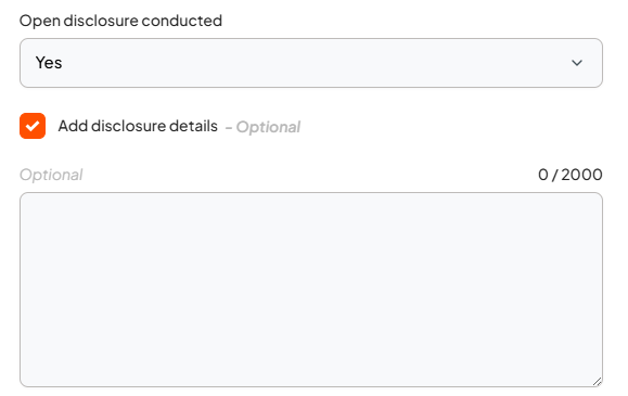 This reveals an additional drop down option in the Manage and Close stage, allowing the manager or approver the option to add disclosure details.
