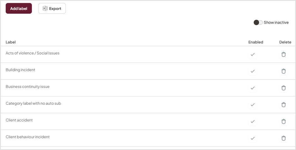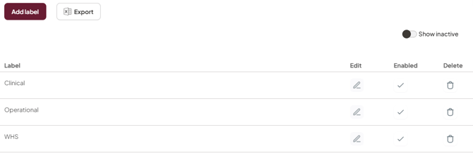 | Re-enable a Label | While Show inactive is on, check the tick in the Enabled column and click Save. |