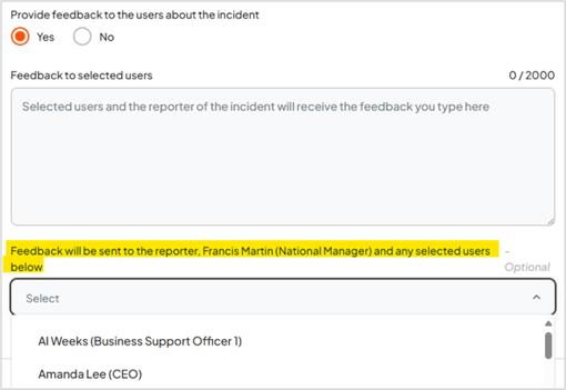- When closing an incident, repair, feedback or improvement, you can now include other users in addition to the reporter.