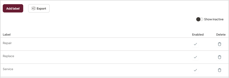 | Re-enable a Label | While Show inactive is on, check the tick in the Enabled column and click Save. |