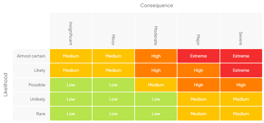 Assessment of risk is based on an analysis on its relative consequence (e.g. outcome or impact) and likelihood (e.g. chance of something happening). To support the assessment of risk, Logiqc provides a risk matrix as a visual and structured way for you to set the risk level.